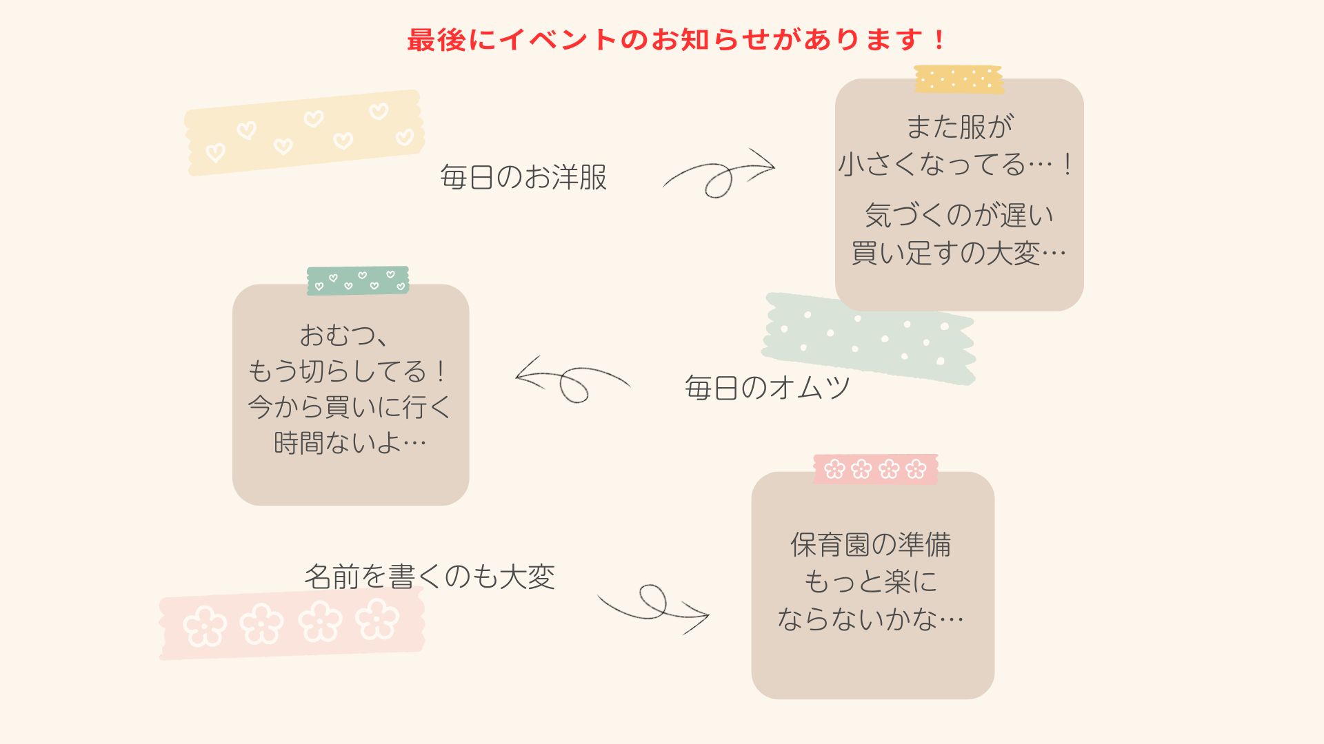 洋服やオムツの準備の煩わしさから解放され、ママやパパ自身の時間のゆとりも取り戻してほしいです!